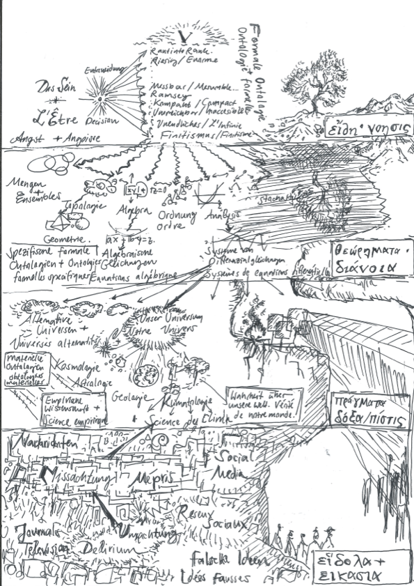 C’est d’abord une ouverture théorique de notre propre situation, une constatation de ce qui est, de ce dans quoi nous sommes tombés ou jetés. Et donc aussi une rencontre avec l’angoisse existentielle, le brouillard de la désorientation, dans lequel une décision doit être prise en faveur de l’anticipation la plus grande possible d’une existence cohérente – la première décision dans la mer mathématique des systèmes axiomatiques formels. Le « plus », qui est bien plus, est la voie des Lumières, et si, à partir de ce point audacieux, l’étant est projeté dans ses caractéristiques formelles de pure extension, alors vient bientôt la possibilité de considérer cette multiplicité de pensées sous différents modes : des ensembles élémentaires aux topologies, à l’algèbre et aux ordres, puis aussi à l’analyse et à la stochastique, dans lesquelles se retrouvent les catégories philosophiques de la chose en soi, de l’intuition, de la permutation, de l’ordre, de la causalité et de l’interaction, et enfin de la connaissance incomplète, c’est-à-dire de l’insuffisance subjective face aux nombreuses issues possibles. Ceci n’est qu’une infime partie d’un fragment de ce monde de l’existence mathématique.