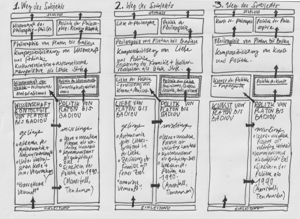 1. Das Kapitalozän Denken – zum Verhältnis von Wissenschaft und Politik nach dem Überschreiten des 1,5 Grad Ziels, Ökologie und Kapitalismus -> Mündet in einem spezifischen Umweltaktivismus und kämpferischer Sozialdemokratie (abgeschlossen, als ein Epizyklus, um Badious theoretische Philosophie zu verstehen und in ihrer Bedeutung für heute auszumachen). Hier wird das aufbegehrende Subjekt hinsichtlich seiner temporalen und räumlichen Ferne vereinigt oder dessen Spaltung aufgehalten. Das Subjekt des Klimawandels, das unterdrückt wird und an die Macht gehört, sind die Klimaflüchtlinge, die eben für uns in der zeitlichen und räumlichen Ferne sind, eben diese Ferne ist, welche die Unterdrückung ermöglicht, dafür, dass sie nicht repräsentiert werden. Die Wissenschaft rückt diese Leute heran, indem sie die Kausalbeziehungen aufweist, und induziert dadurch einen neuen politischen Prozess.