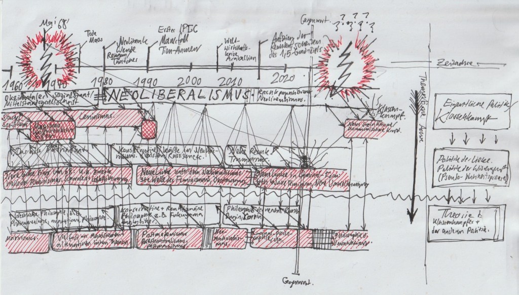 Zentral ist: Die Revolution darf nicht zu sehr in den Maßstäben, nach den Regel und der Struktur von 68 gedacht werden. Auch dürfen die „Werte“ die in 68 etabliert worden sind (insbesondere die der Sexualität und des Antirassismus), nicht als Maßstab und Norm einer Prüfung „echter“ revolutionärer Kräfte gewertet werden, sie werden zwar nicht rassistisch, sexistisch, homphob sein, aber eben antirassitisch, antisexistisisch usw auf eine Weise, die vielleicht für die Gegenwart unbegreiflich ist. 68 ist auch deswegen geschehen, weil es alle bisherigen bekannten Regeln der Revolution – also namentlich die Kommune von Paris und die Oktoberrevolution „über den Haufen geworfen“ hat, d.i. von libertären, „kleinbürgerlichen“ Kräften, von marginalisierten Gruppen und antiautoritären neuen Linken – Feministinnen, Homosexuellengruppen, Umweltbewegungen getragen worden ist. In einer ähnlichen Weise können wir davon ausgehen, dass die Revolution ganz anders sein könnte, als die bisherigen Revolutionen, also insbesondere 68, sowohl von den Inhalten her als auch von der Struktur, aber natürlich kann es auch umgekehrt sein, dass es genau wie 68 wird, nur größer; man muss sich dieser möglichen ganz-Andersartigkeit aber bewusst sein. Das ist zuletzt, in dieser bloßen Negativität eine leere Feststellung ohne großen Wert, aber es hat eine gewisse Zuträglichkeit, sich dies vor Augen zu halten. Klar ist: Die Antizipation einer künftigen Revolution ist immer auch die Antizipation einer neuen Generation, welche anders denkt und welche die Macht, das revolutionäre Bewusstsein ist das von Eltern, die sich für die kommenden Menschen öffnen und ihre weltanschauliche Eigenständkeit ermöglichen, keine bloße Kopie ihrer Selbst erzeugen wollen. Auch sind Revolutionen stets ein Wagnis in dem Sinne, dass sie in eine rechte Welle umschlagen können: Occupy und die Arabellion, beides Reaktionen auf die Weltwirtschaftskrise gegen 2007, mündeten in der neuen rechten Welle des Trumpismus und dem Islamismus – sie eröffneten beides; das mag aber auch daran gelegen haben, dass sie scheiterten. Wer mag je wissen, welche Tendenz dominierte und den Ausschlag gab?
